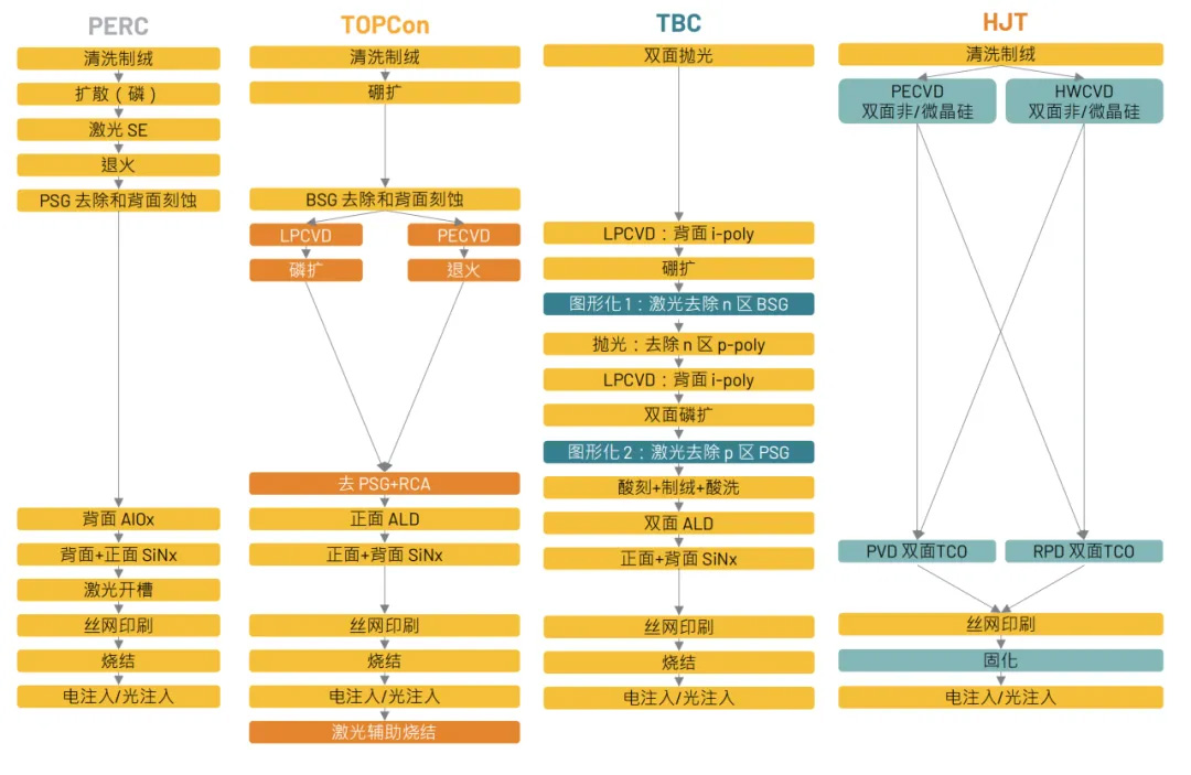 태양전지는 태양광 산업 체인의 핵심 요소이며, 그 변환 효율은 태양광 시스템의 발전 성능에 직접적인 영향을 미칩니다. 현재 시중에 출시된 주요 태양전지 기술로는 PERC, TOPCon, HJT, xBC 등이 있습니다. 변환 효율의 이론적인 상한값은 기술 경로에 따라 다릅니다. PERC는 24.5%, TOPCon은 28.7%, HJT는 28.5%, xBC는 29.1%입니다. 양산 전환 효율 측면에서는 PERC가 약 24%, TOPCon은 약 26%, HJT는 약 26%, xBC는 약 27%입니다.